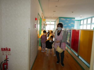本日はちゅうりっぷ組の調乳室からの火災を想定した避難訓練を行いました。